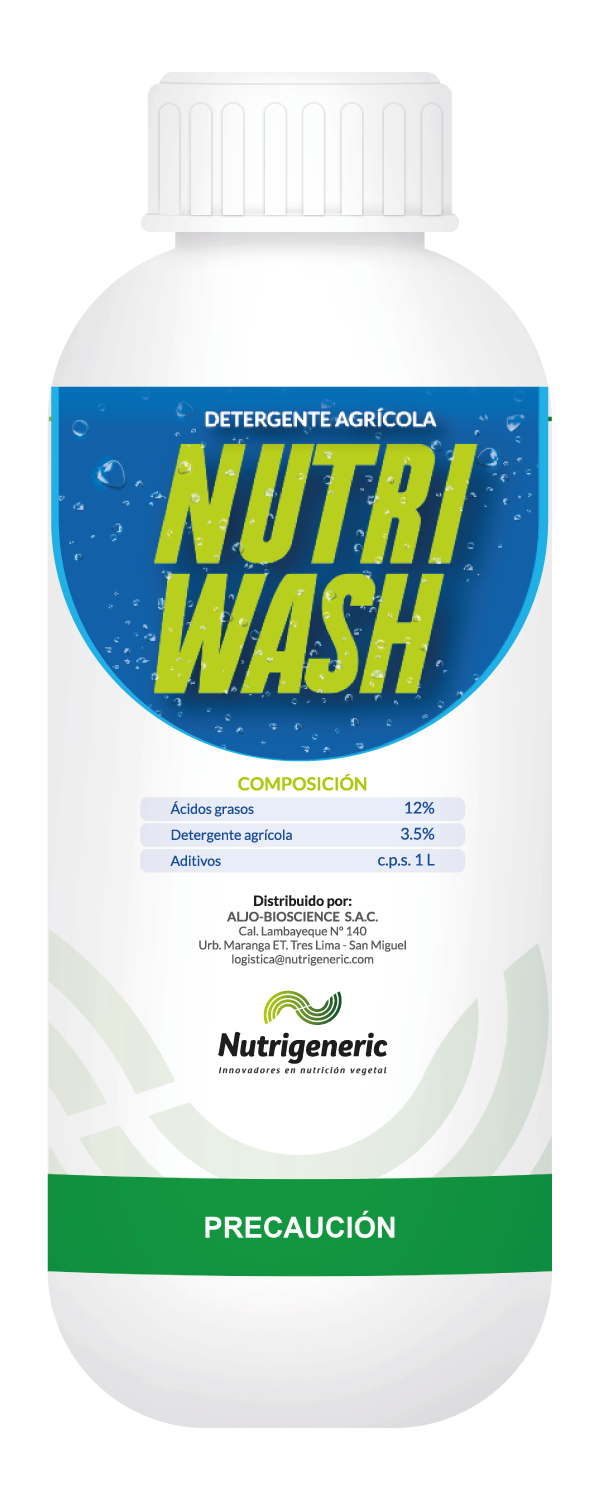 NUTRIWASH es un detergente agrícola potásico bacteriostático biodegradable, que contiene en su formulación ácidos grasos los cuales son ceras naturales que cumplen la función de un excelente lavado de árboles, flores, hortalizas, frutas, etc. Así como también una eficiente remoción de insectos de cuerpo blando tales como ácaros, pulgones, mosca blanca, esporas y posturas presentes en los cultivos.